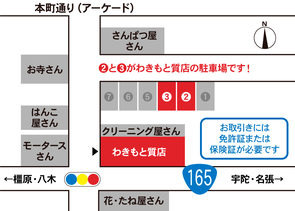 7つ目の信号左角(165号沿い)にわきもと質店があります。